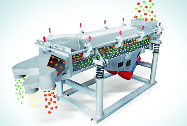 直線振動(dòng)篩利用振動(dòng)電機(jī)激振作為振動(dòng)源,使物料在篩網(wǎng)上被拋起,同時(shí)向前作直線運(yùn)動(dòng),物料從給料機(jī)均勻地進(jìn)入篩分機(jī)的進(jìn)料口,通過多層篩網(wǎng)產(chǎn)生數(shù)種規(guī)格的篩上物、篩下物、分別從各自的出口排出。具有耗能低、產(chǎn)量高、結(jié)構(gòu)簡(jiǎn)單、易維修、全封閉結(jié)構(gòu),無粉塵溢散,自動(dòng)排料,更適合于流水線作業(yè)。